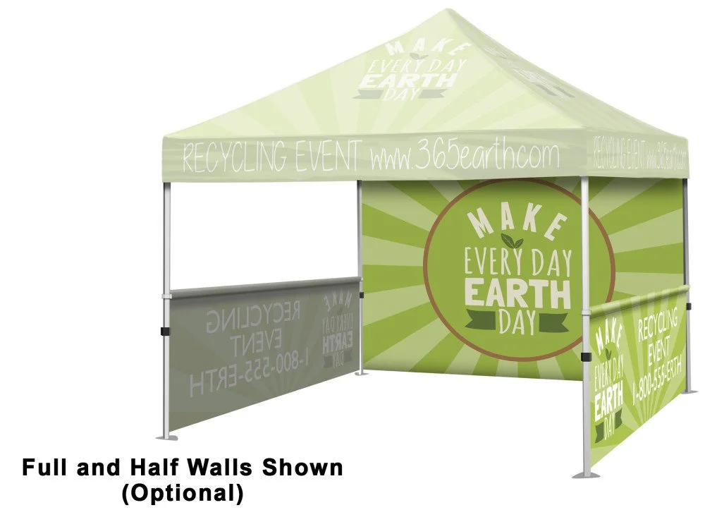 Achieve seamless branding with our full fabric dye sub canopy, capable of taking your artwork across the entire tent for a vivid, uninterrupted display. Unlike competitors’ tents, which often depend on limited vinyl graphics, our large format full-color capabilities allow your brand message to shine from seam to seam, on each of the four peaks and valance panels. Customize your tent further by adding full or half walls to any side.